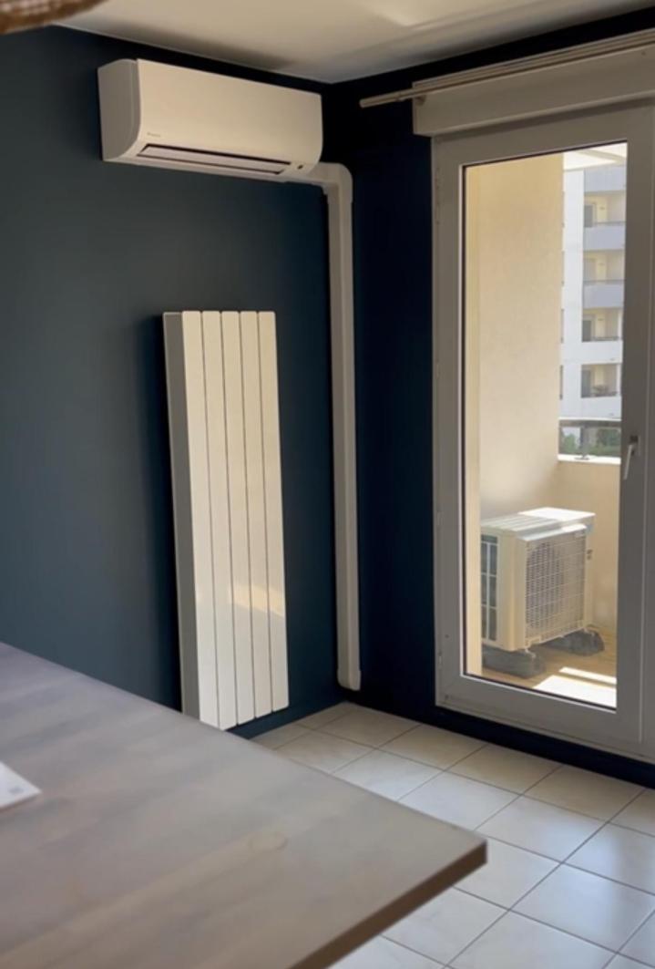 Climatisation chauffage du salon de cet appartement au moyen d'un climatiseur réversible de marque Daikin. Le groupe est positionné sur le supportage anti-vibratile, sur le balcon.